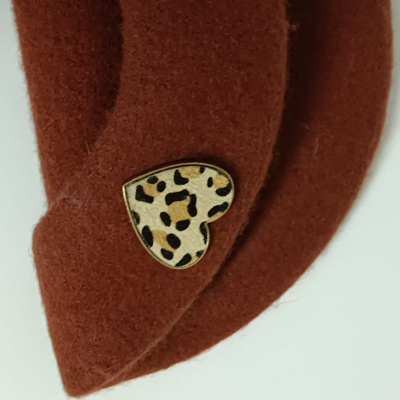 Boina de lana color teja, lleva un adorno metálico estampado animal print.