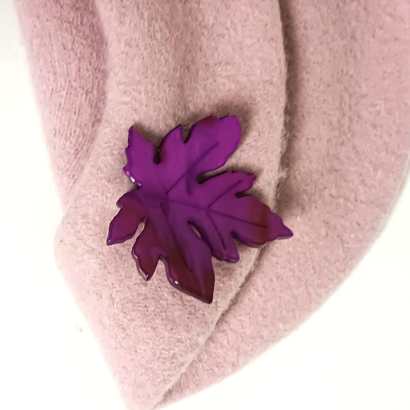 Lleva como adorno un alfiler de resina con forma de hoja de quita y pon.