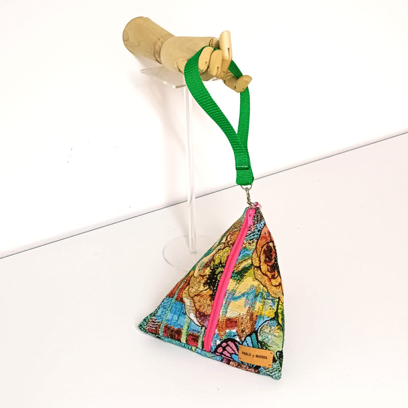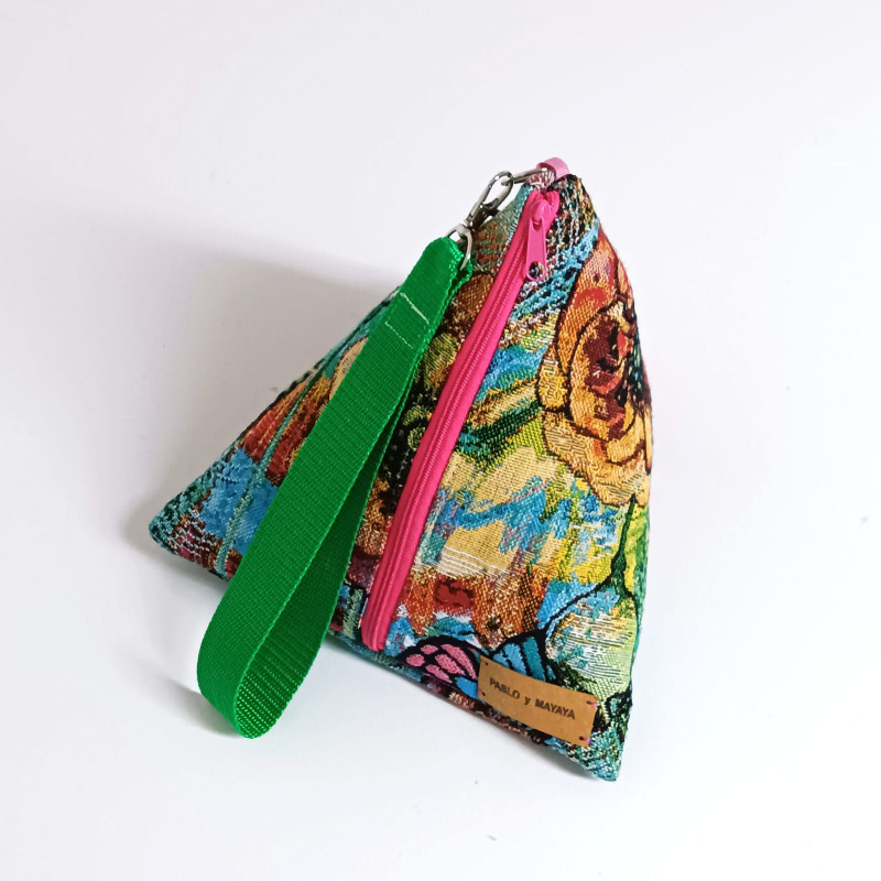 Bolsito con forma triangular hecho con tela de tapicería estampado con flores y mariposas.