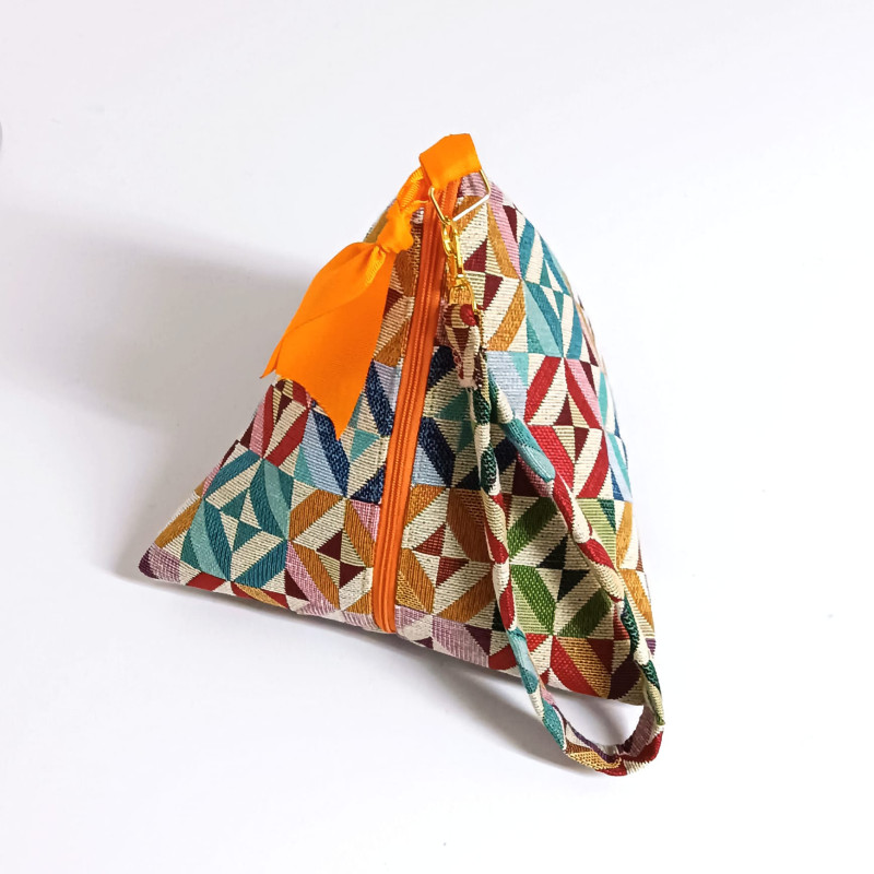 Bolsito de forma triangular hecho con gobellino de formas geométricas en muchos colores.
