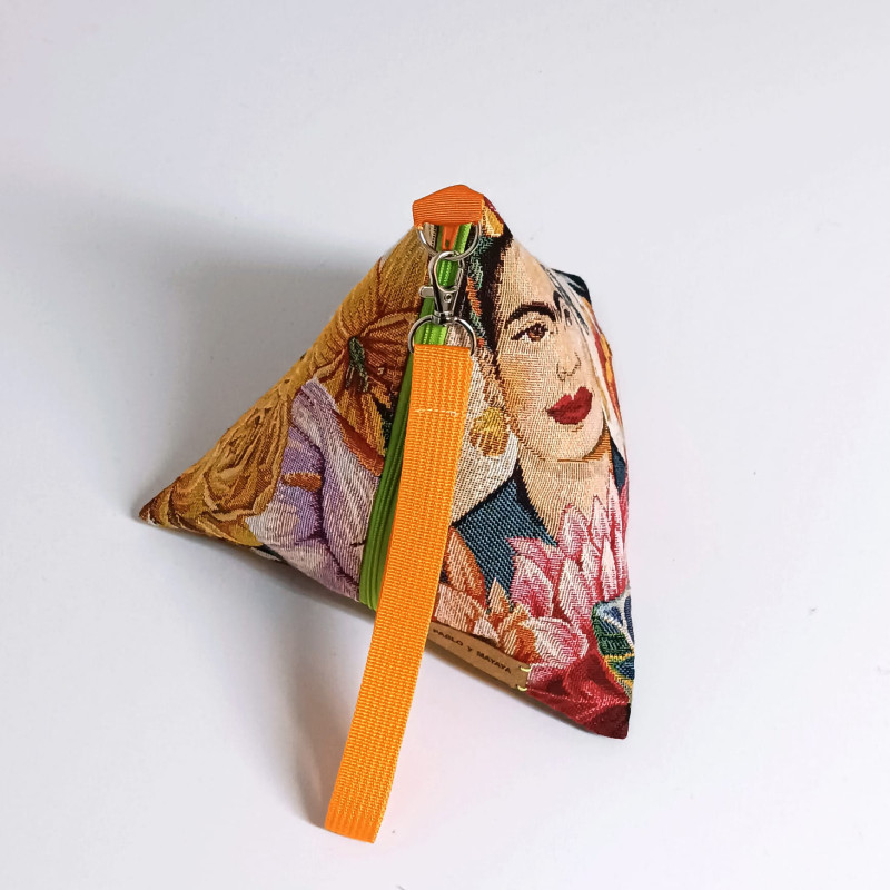 Bolsito con forma triangular hecho con gobellino estampado de Frida Calo.