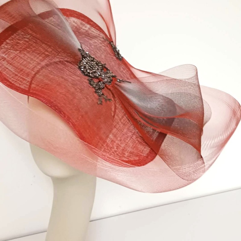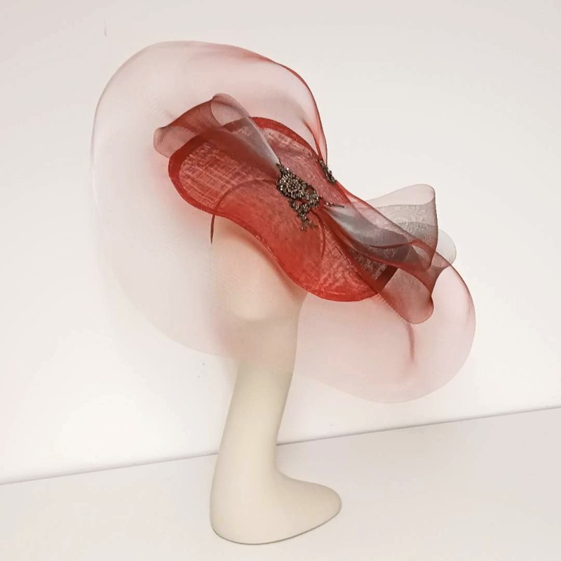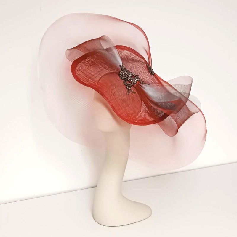 Pamela de paja de forma cuadrada con gran ala de crin, grandes lazadas y pedrería.