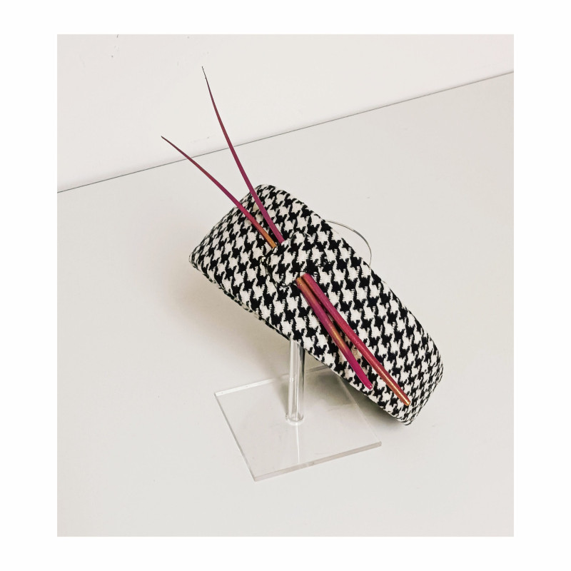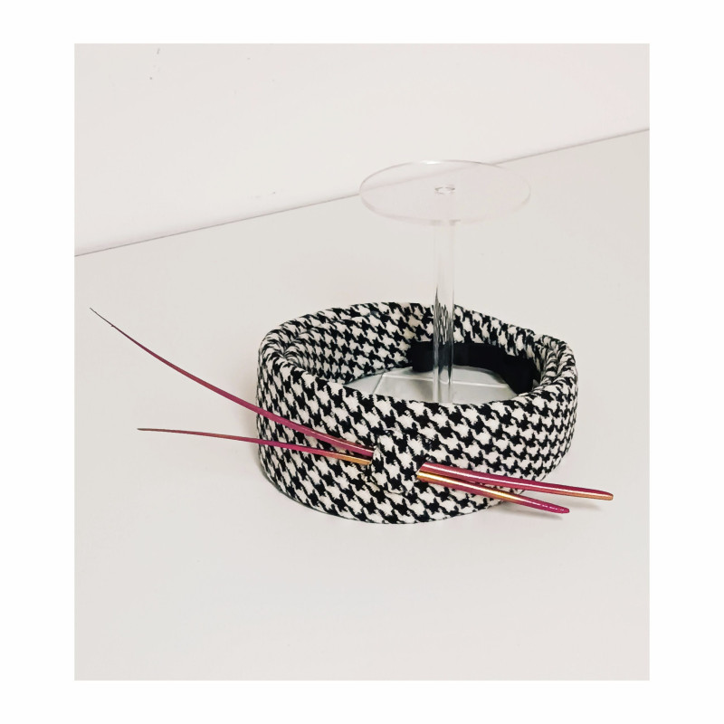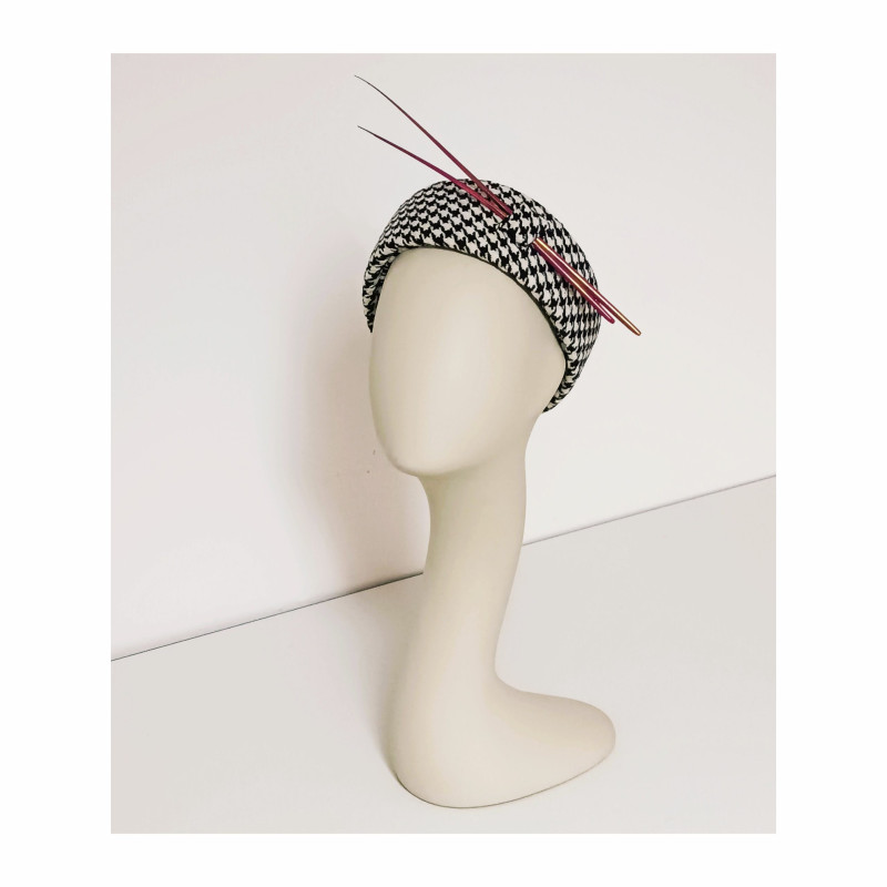 Tiara forrada de tela estampado pata de gallo blanco y negro.