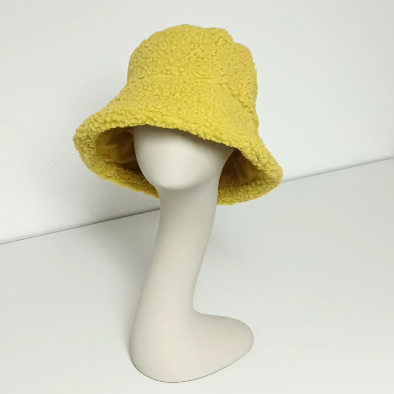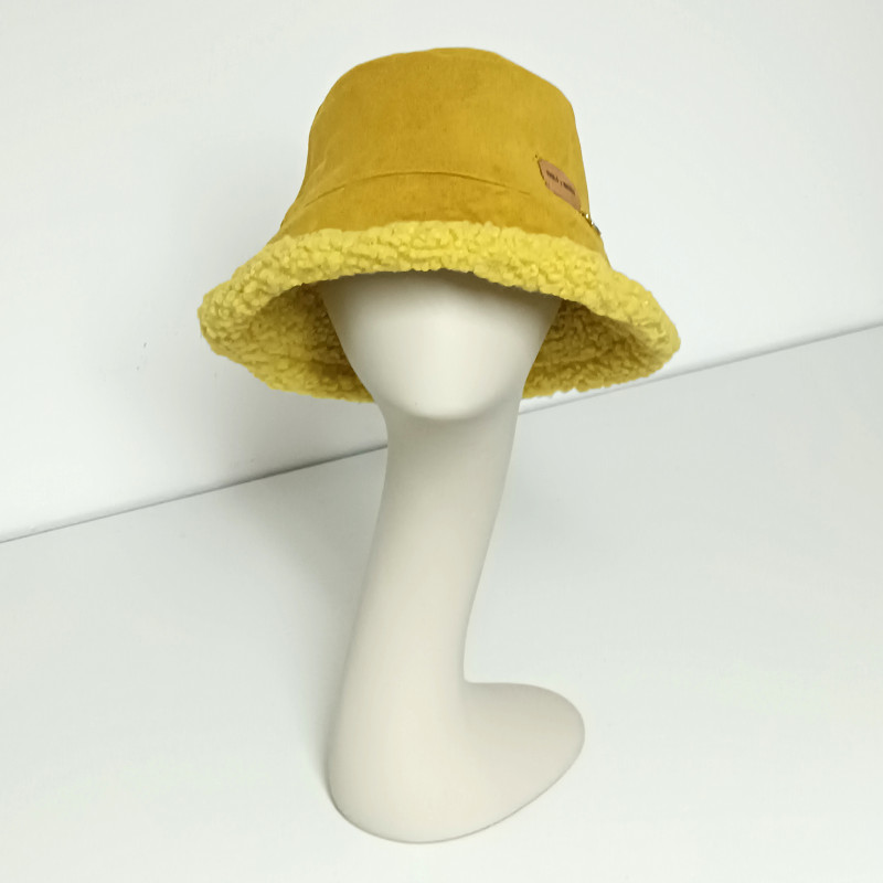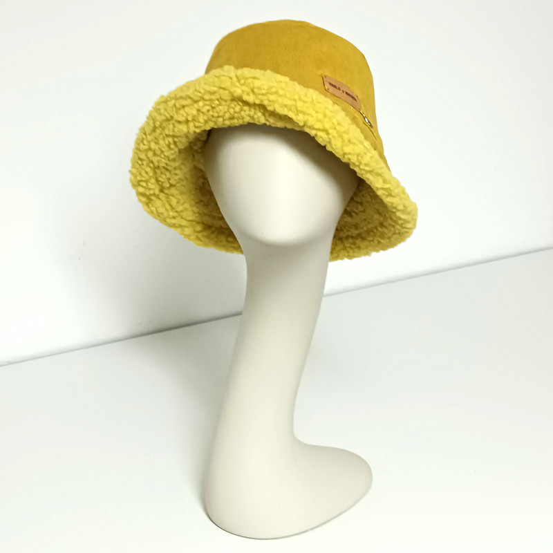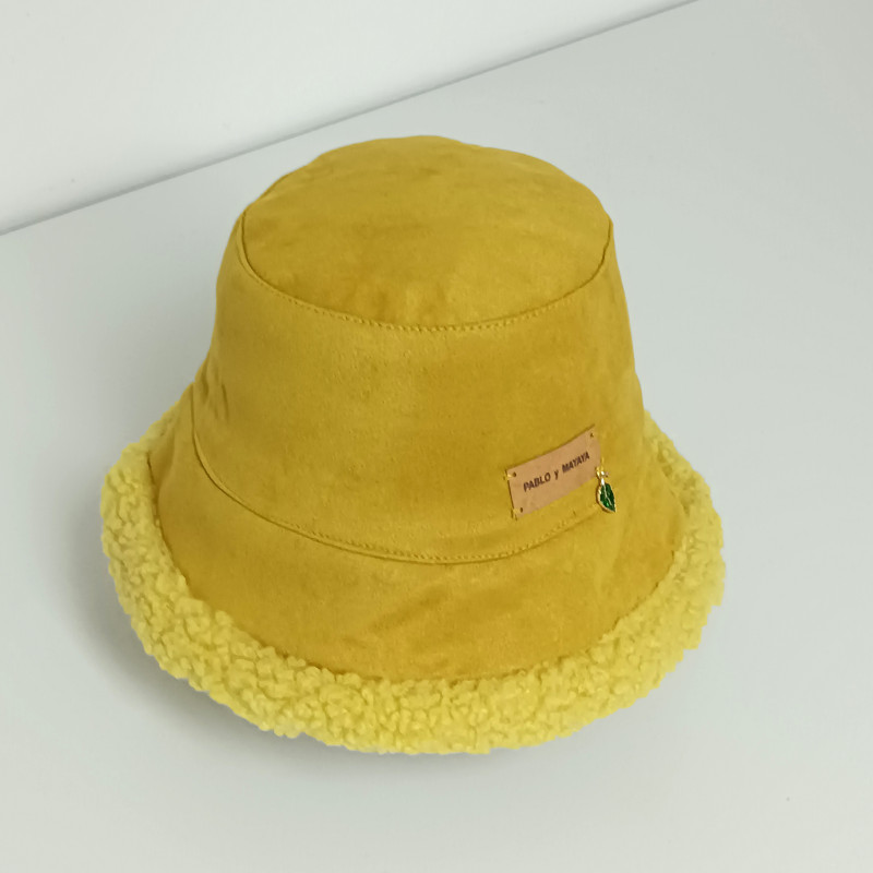 Gorro tipo bucket hat de antelina y rizo reversible.