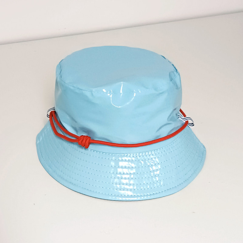 Lighy blue patent-look rain cap, adjustable with maroon drawstring.